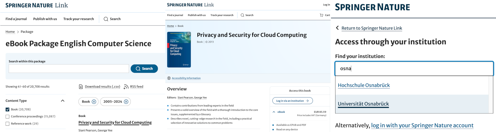 Es startet die Webpräsenz "Springer Nature Link". Die Anmeldung erfolgt für Xaver Mustermann über die Schaltfläche Log in via an institution nach Auswahl eines eBooks. Die Institution, Universität Osnabrück, kann per Suche aus der vorgegebenen Liste gewählt werden.